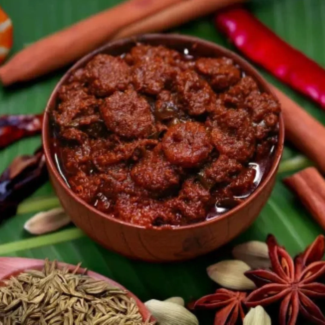 Andhra coastal?style prawns pickle?plump prawns simmered in spices and chili for a fiery, savory condiment.