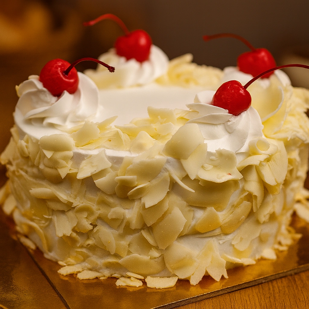 White forest variant with vanilla sponge, cream, and cherries. Light, creamy, and beautifully garnished.